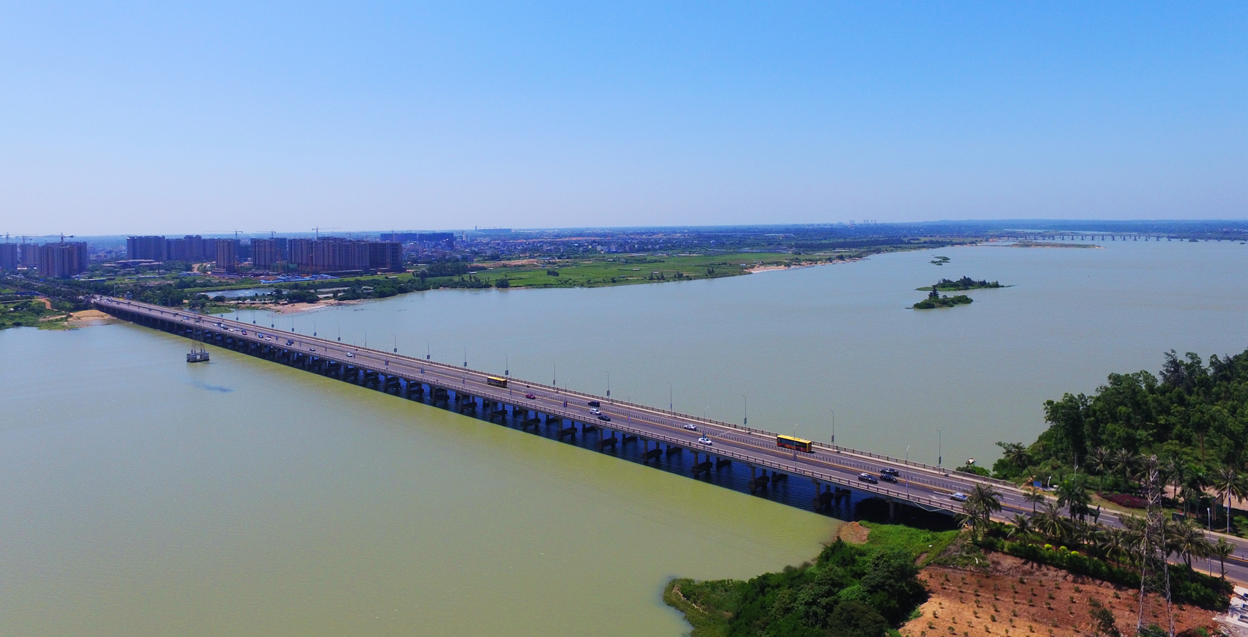 项目内容:全长1396.93米。琼州大桥横跨南渡江,桥梁主跨采用五孔钢管混凝土拱结构。
